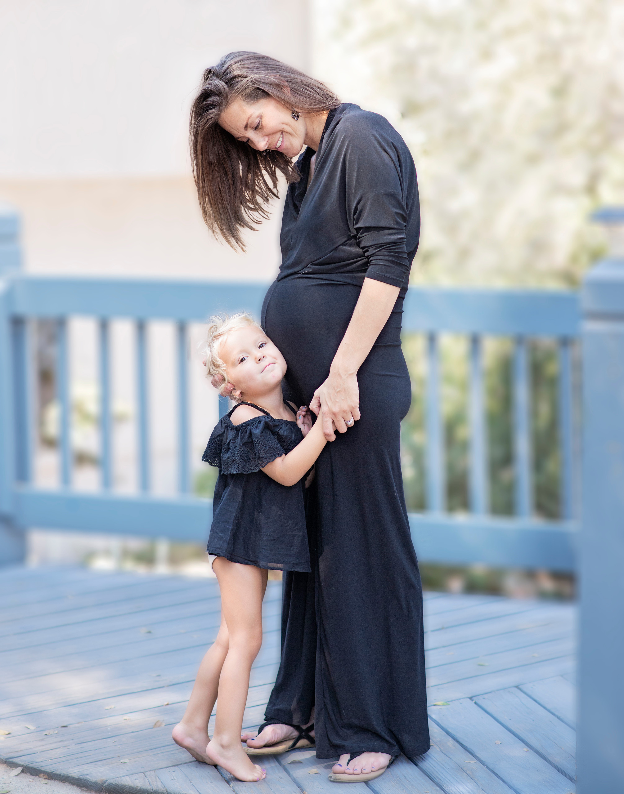 These designers know what it’s all about. I really wanted to find comfy brands instead of MooMoo dresses and plus size options from Target this go around. I stumbled upon @tiffmariematernity on Instagram and Insta fell in love with the style. When I put this outfit on, my daughter kept rubbing my tummy telling me how soft I felt – haha. (Littles tell it like it is.) This maternity line is designed by a fellow mama who knows how to rock a bumb in style. See ya later Moo Moo’s. The particular style I got is perfect for a gender reveal shoot with a pop of blue or pink! Eeeeeek!