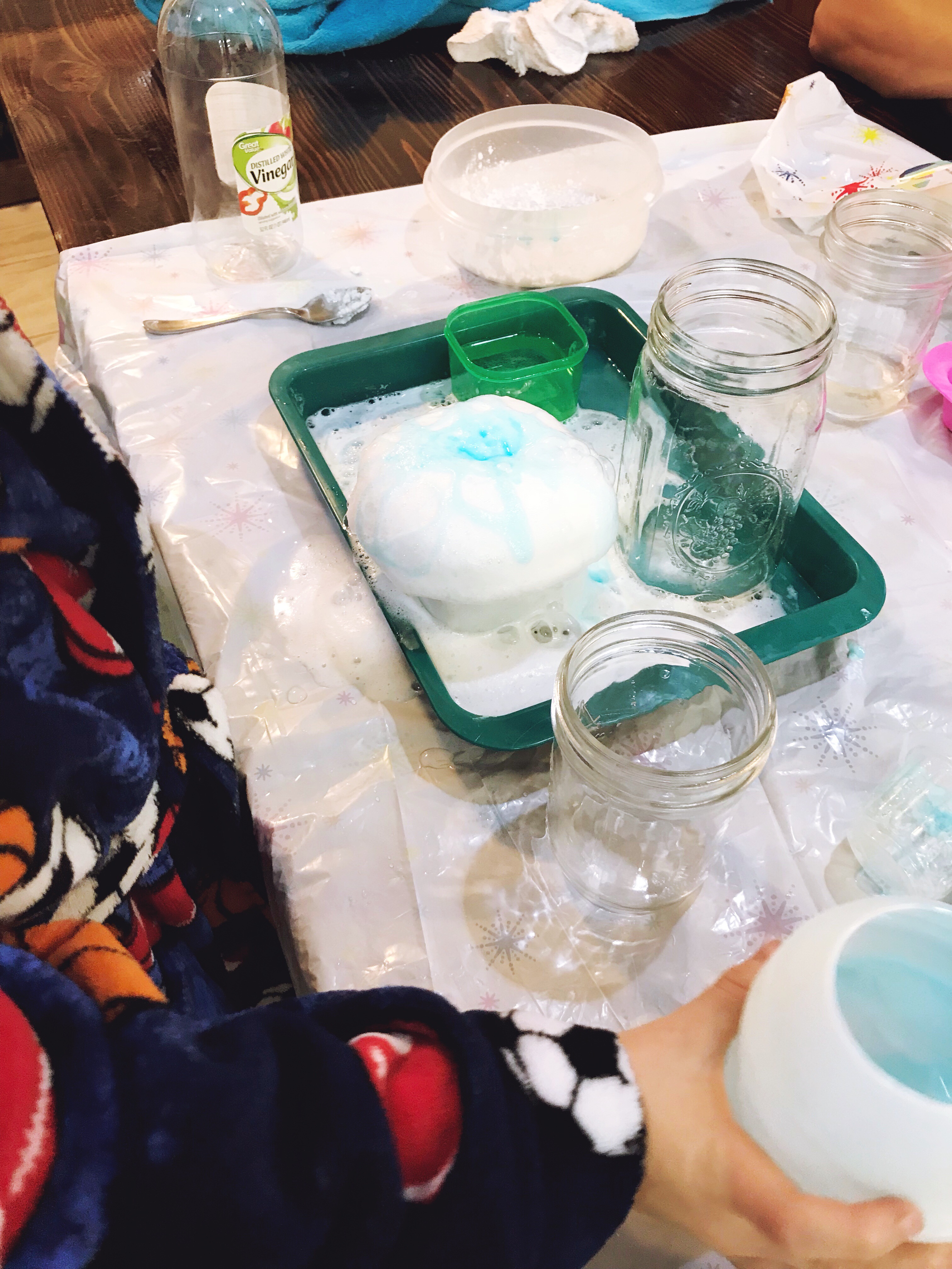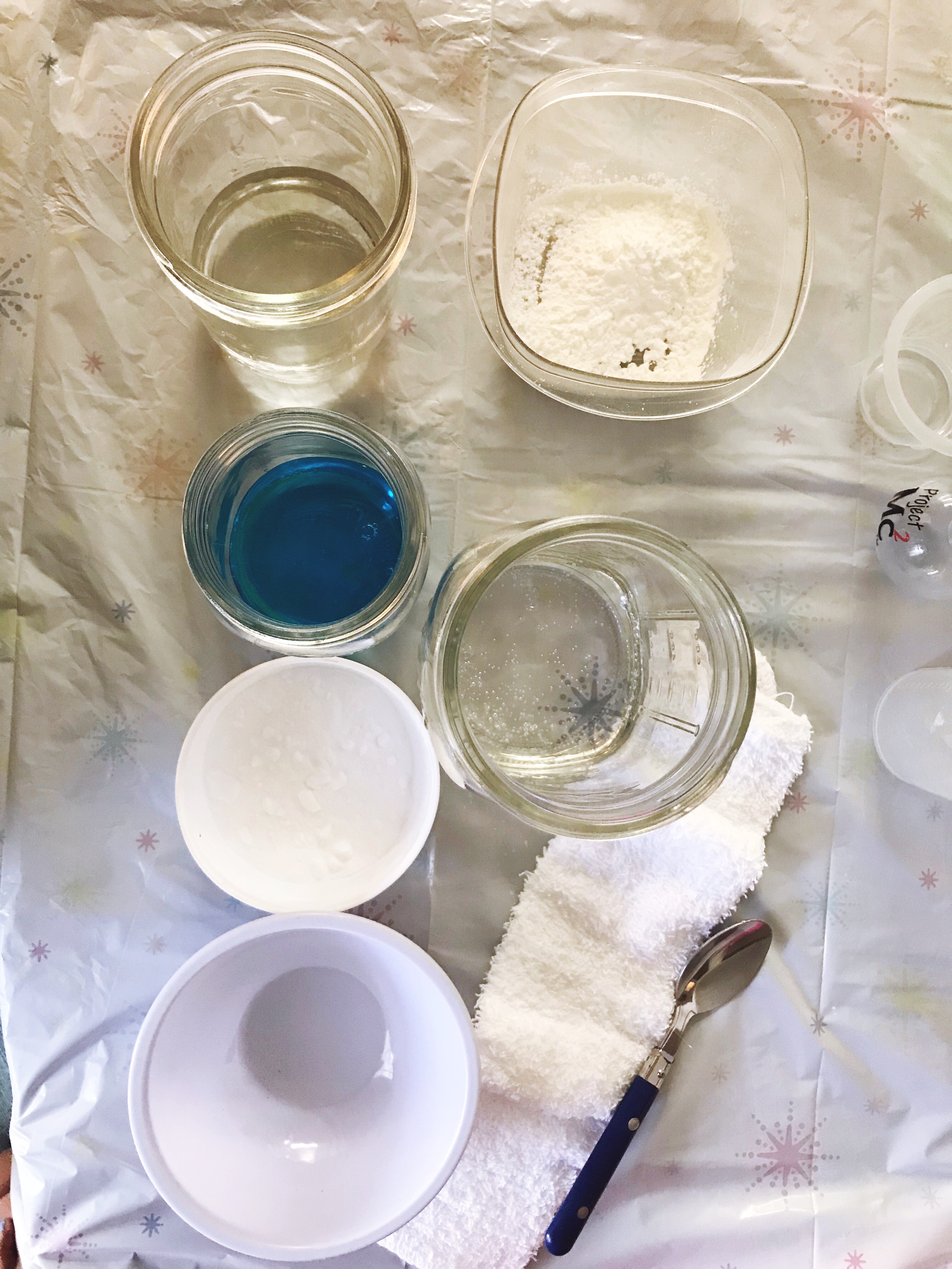 I take different Tupperware, mason jars, and mixing cups I have lying around the kitchen and place different fun ingredients inside. (You can honestly use any thing kid safe in your kitchen) but a couple suggestions to get your wheels spinning…