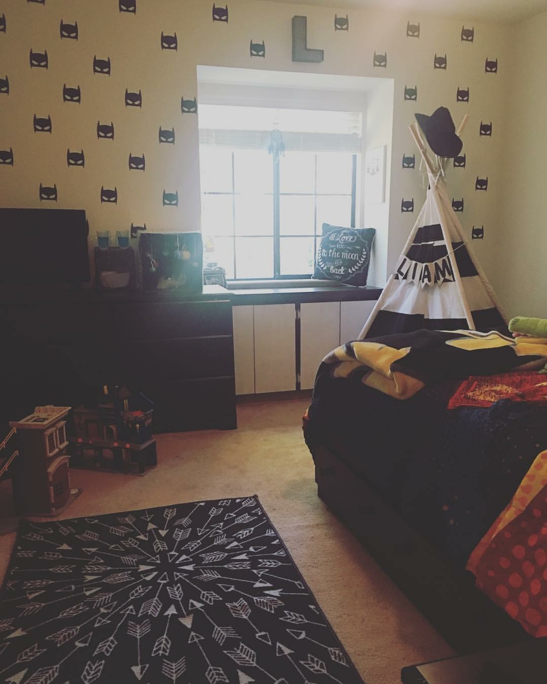 Our home has these amazing reading nooks in every room and bathroom (one of the reasons I absolutely fell in love with the house.) I really wanted to add to this element of the room so we picked some canvas style black out curtains in grey and a shine triangle pattern to add some more fun spots to squirrel away and cozy up to a good book. (My son is all about creating forts if you couldn’t already tell.)
