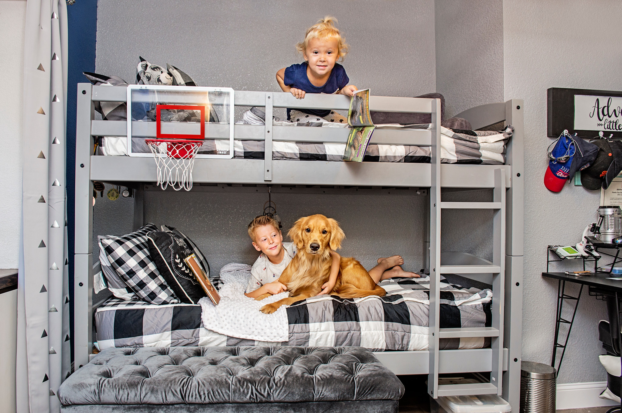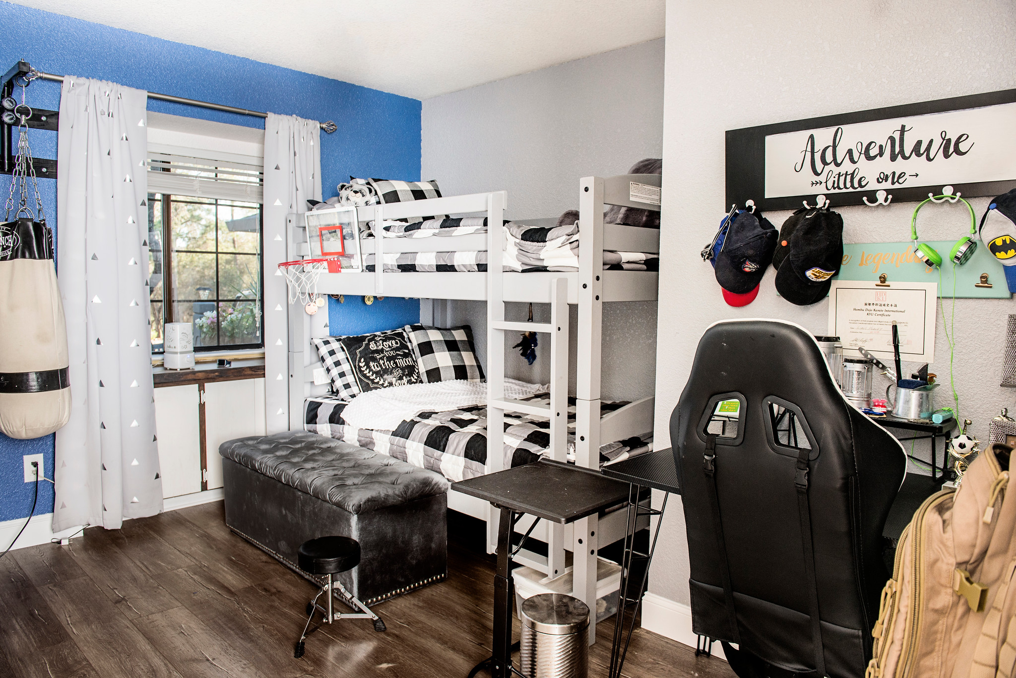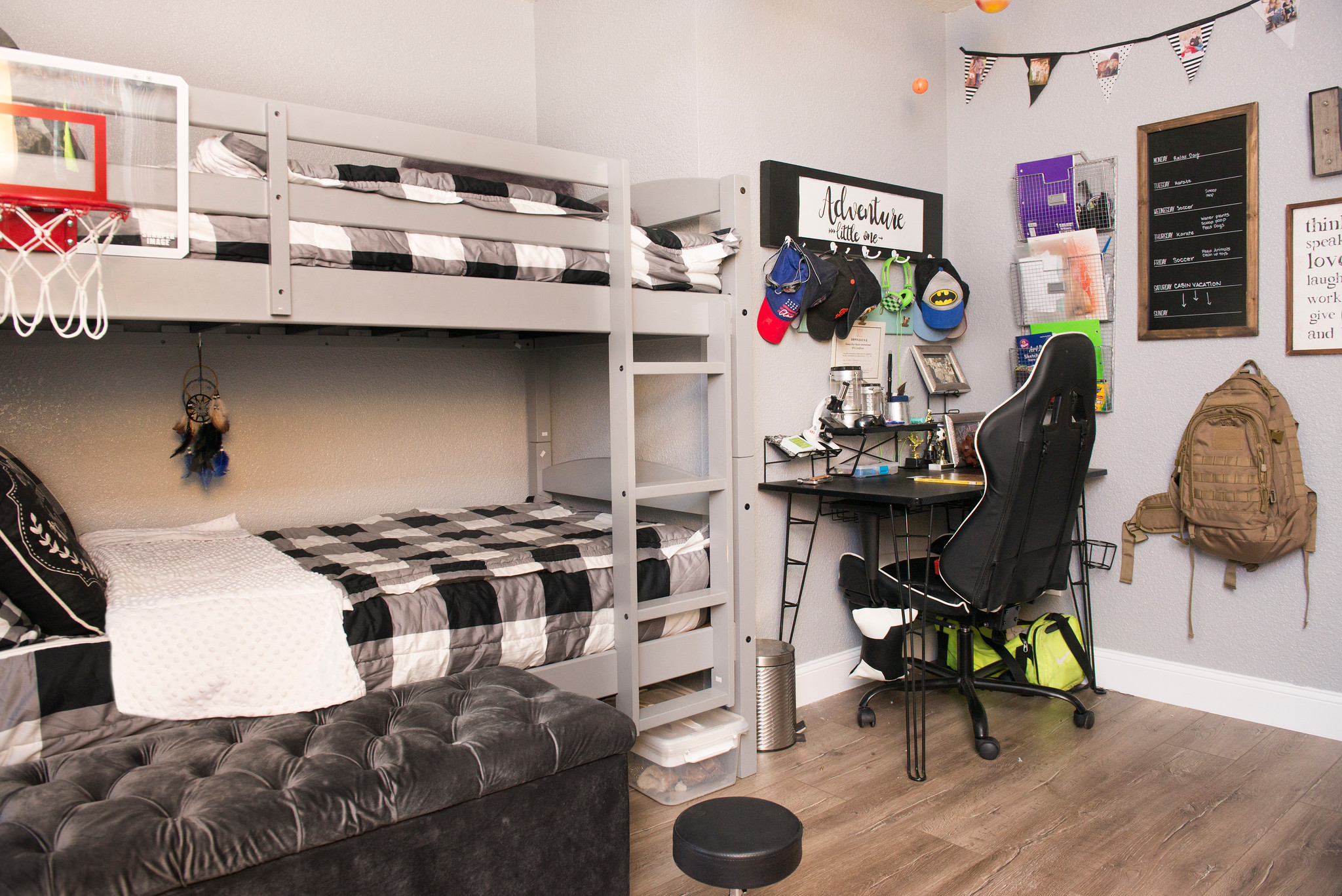His bunk bed we added little fun accents like LED lights on the bottom bunk for a “fort camping feel” and a basket ball clip on hoop for the top bunk.
