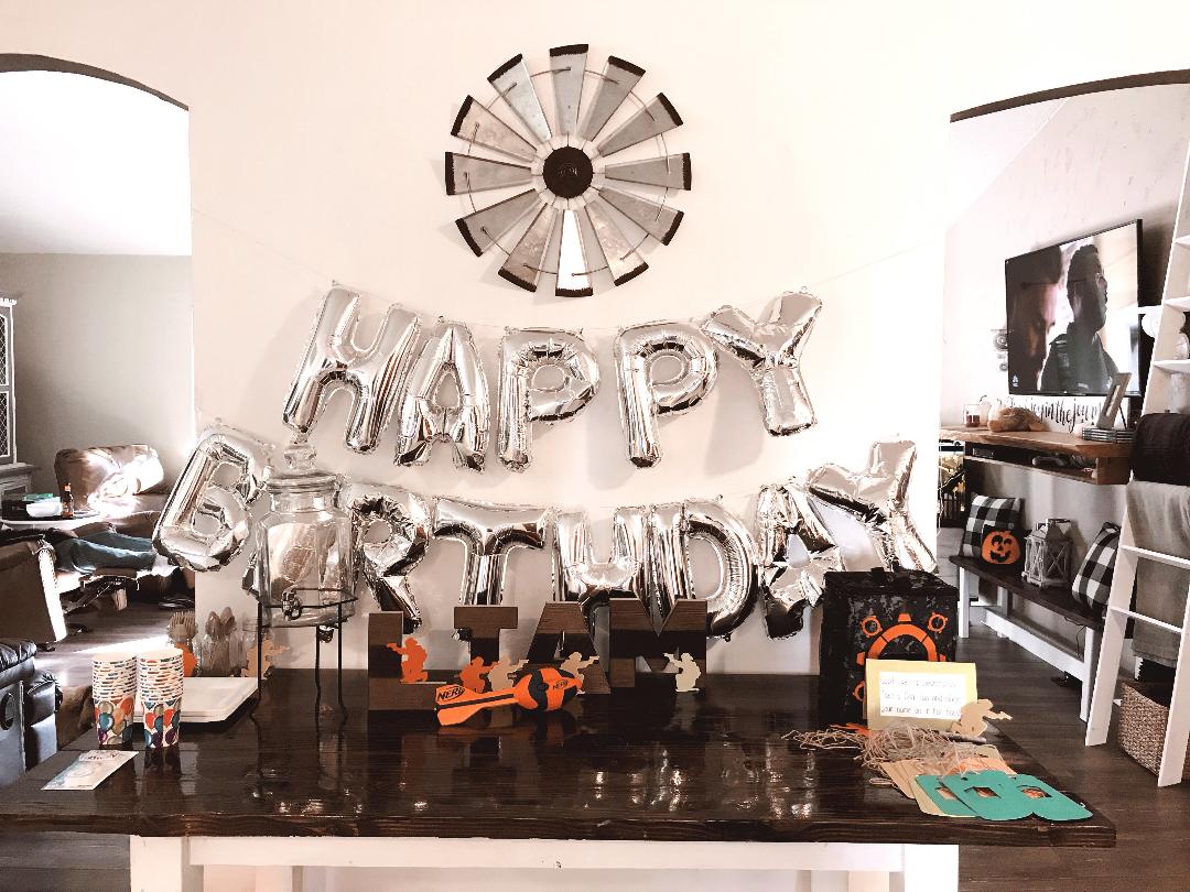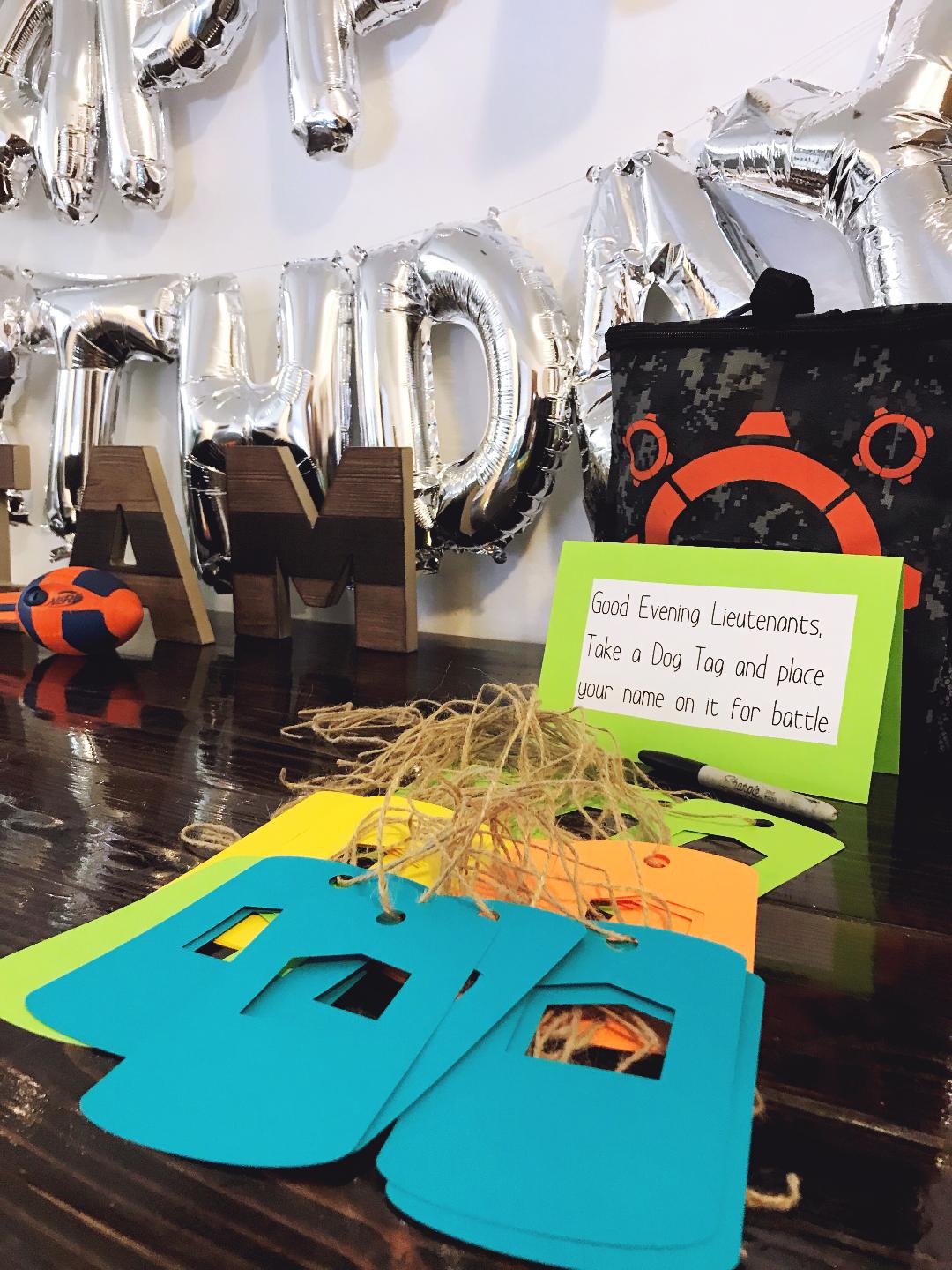 Dessert Tables are Everythanggggg. A grand entrance statement to make your guest say Wowza is the trick. I use my kitchen table, push it up against the wall and go to town. For this party I grabbed a Happy Birthday balloon pack at Michael’s for $5 and some cute wood letters to spell my son’s name that were also on clearance. If you shop right they always have 40% off coupons as well you can whip up on your phone before checking out. For the Nerf tags and printable’s I used some scratch paper lying around and created a word document to type up some cute little sayings to get the boys ramped up.