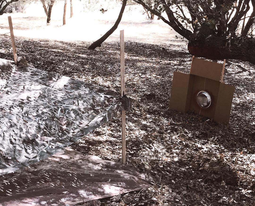 He then made an army crawl station with some tarps, stakes, and string.