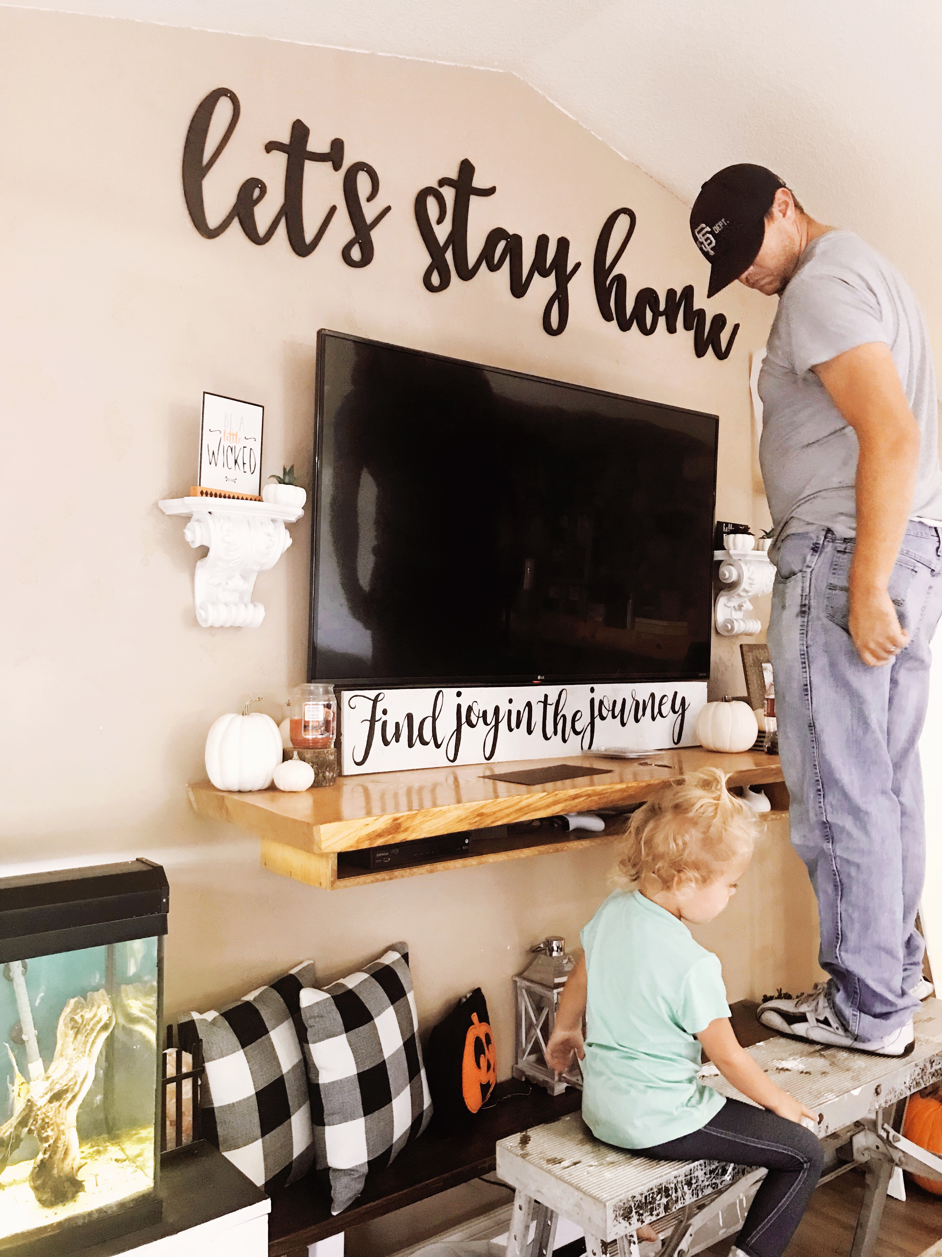 Wood Die Cuts are my new-found love – I have them in our living room and littles rooms and they are a perfect way to make the room feel more “homey”. Craft Cuts creates any phrase you want or they have several selections of pre cut items to choose from as well. You can hand paint or spray paint depending on the look you are going for – We wanted a simple black for our living room to match year round so I just went with spray paint when doing our “Let’s Stay Home”  Get Your Custom Cuts Here