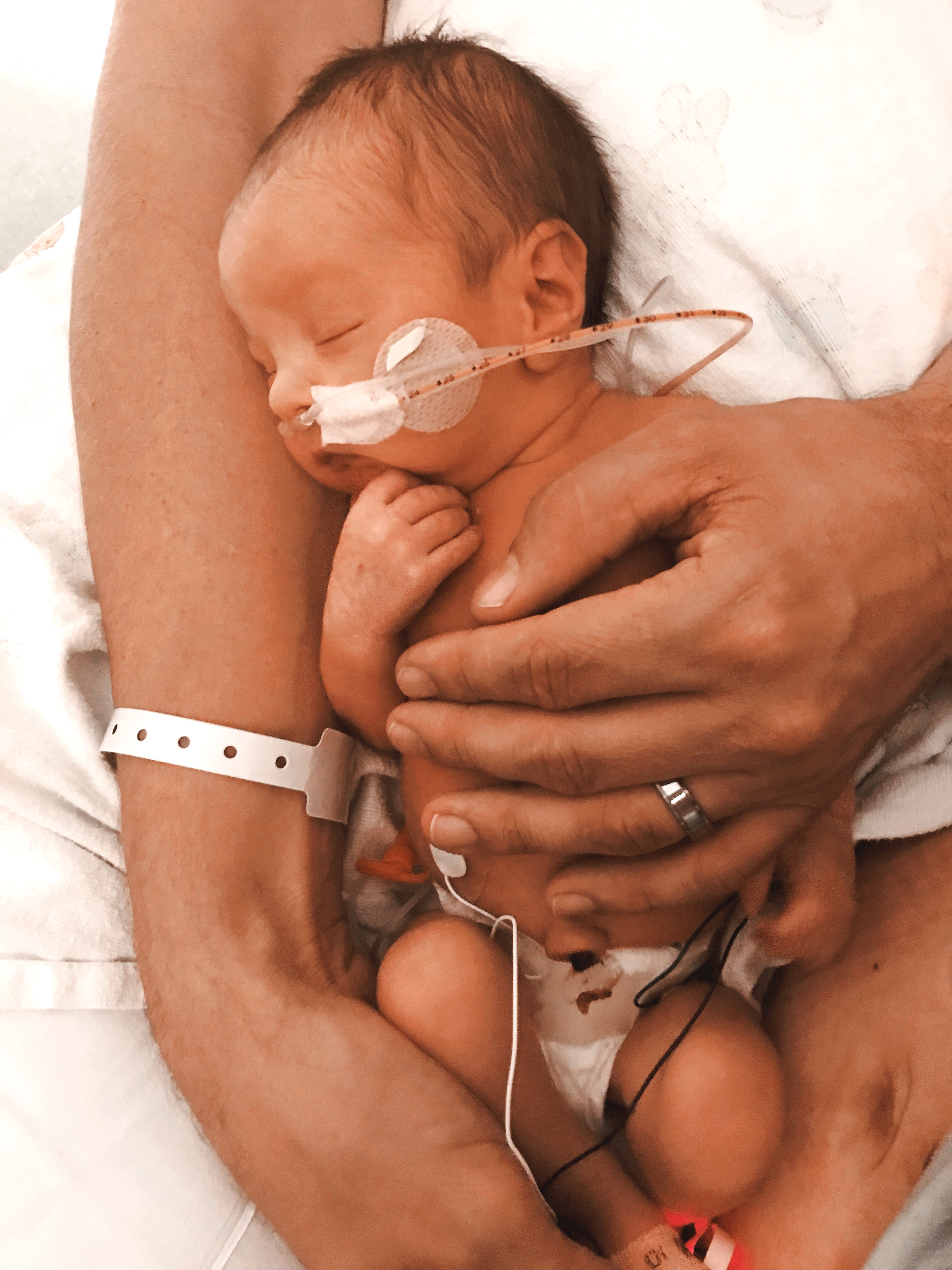The surgery went perfectly smooth and I heard my sweet baby cry for the first time and all just felt right in the world. I was expecting them to put him on my chest for the immediate skin to skin while my surgery was wrapping up and minutes went by and my baby was nowhere to be found. I looked over and saw him under a monitor with doctors and nurses surrounding him. The doctor continued to reassure me everything was fine but he was having trouble breathing. My husband talked them into giving me one second with him and as tears were streaming down my cheeks and he was taken away to NICU. I had no idea what was going on, what was wrong with him, when I could see him. I just sat on this ice-cold table unable to do anything. They transferred me to recovery and as I sat in this room by myself I have never felt such an emptiness in my life. The sobbing was so out of control after thirty minutes my eyes were literally swollen shut. The nurse just sat with me while my husband went to go check on the baby. The nurse informed me that I most likely would not see my baby until the next day because I needed to recover. After demanding to see my baby we came to an agreement that if I could wiggle my toes she would sneak me down in a wheel chair. Within 30 minutes after surgery I was wiggling my toes, and after an hour I was walking to the Nicu to meet Tristan.