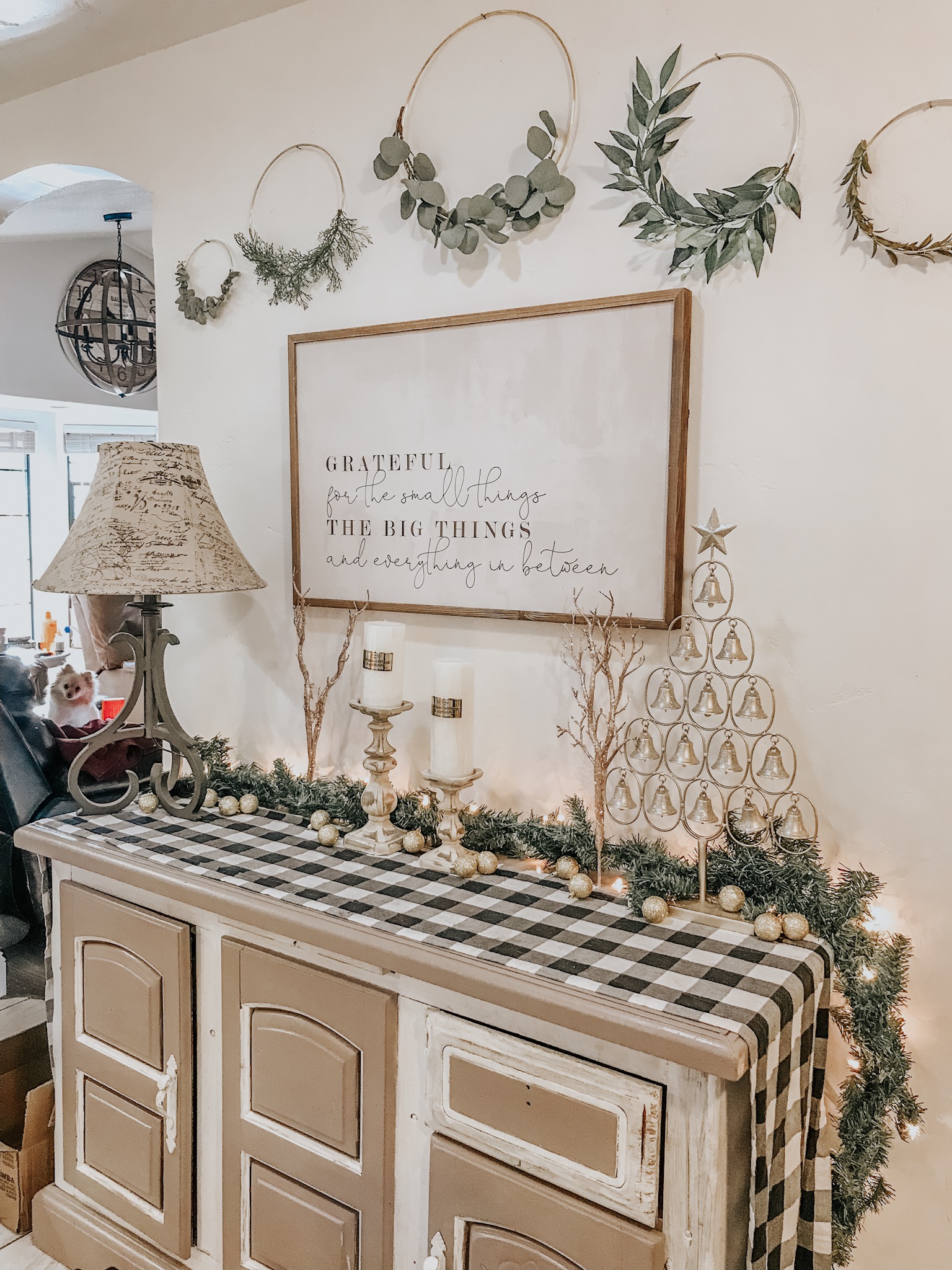 My husband is a fan of traditional Christmas Decor and I love the pinks and non traditional color pops so we met in the middle for a modernized farmhouse style buffet.